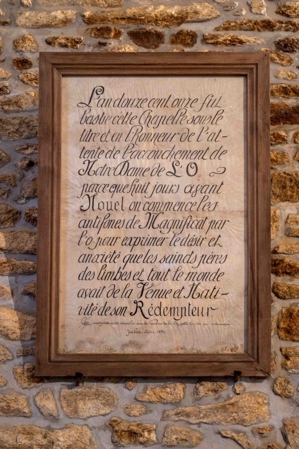 L’an douze cent onze, cette chapelle a été bâtie en l’honneur de Notre Dame de l’Ô, en mémoire des Ô, qui commencent les antiphones de Magnificat des huit jours qui précèdent la fête de Noël et qui expriment les désirs et l’anxiété des Saints Pères des limbes et de tout le monde qui attendaient le divin accouchement.