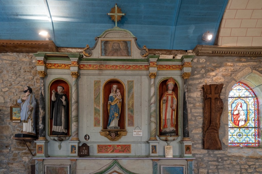 Un grand retable genre renaissance, placé assez loin dans la nef, s’appuie à la longère nord. Notre Dame de l’Ô y préside, ayant à sa droite Saint Vincent Ferrier et Saint louis, en chêne polychromé, restauré en 2011, à sa gauche Saint Cadoc.