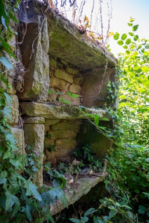 A l’intérieur, un muret vaisselier placé à gauche de la porte d’entrée, composé de trois tablettes en granit, d’un mètre environ, et une cheminée à corbelets granit.