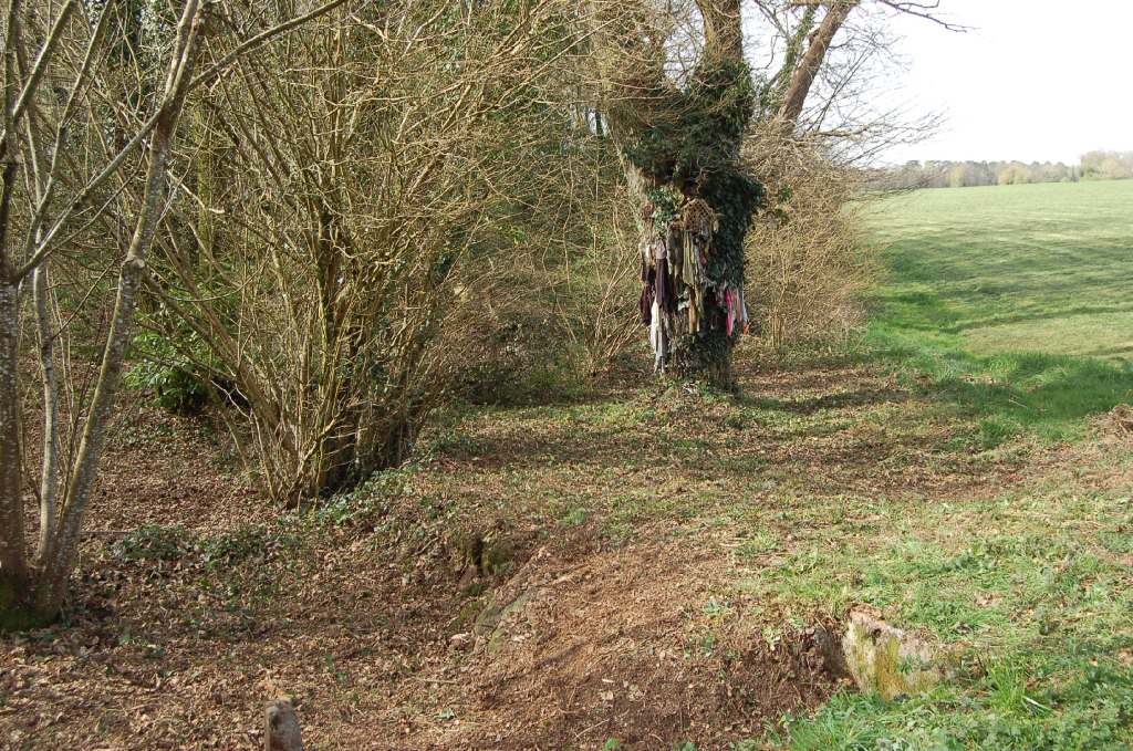 Au dépôt de vêtements se mêle de petits sachets de terre qui renferment des objets en rapport avec le souhait à réaliser. C’est ainsi que l’on peut trouver des mégots de cigarettes pour arrêter de fumer, des emballages de médicaments pour accroitre leur efficacité… Si cette façon de faire s’observe parfois lorsque le lieu de dévotion est une tombe, comme celle de Mme de COETLOGON à Rennes, elle est en revanche rare quant il s’agit d’un arbre.